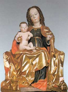 Es handelt sich um eine Schnitzerei aus der Spätgotik um 1480. Das Gnadenbild hatte festliche Kleider und ist nur an dieser als Dorfener Madonna zu erkennen. (siehe unten)
