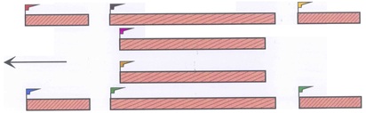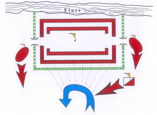 Die Länge einer Kolonne mit Kampfkarren konnte mehrere Kilometer betragen. Sie quälte sich durch das Gelände auf unbefestigten Wegen (Abb. 13). Das Auffahren musste gut organisiert sein. Die Karren, hinter denen sich die folgenden Wagen beim Zusammenfahren zur Wagenburg schnell einzureihen hatten, waren mit Positionsfahnen gekennzeichnet. Erst mussten die Schmalseiten auffahren, dann die Längsseiten (Abb. 14 - 16). Nach dem Auffahren, dem Ausspannen und dem Schließen der Lücken wurden die Geschütze auf die dem Feind zugewandte Seite gebracht. Diese Kammergeschütze erlaubten, wie oben geschildert, das Bedienen der Waffen auf den Fahrzeugen ohne vor die Karren treten zu müssen. Innerhalb der Wagenburg hielten sich an den Toren die Reserve zu Fuß und in der Mitte die Reiterei auf (Abb. 17). Die Hussiten erwarteten ihre Gegner, ließen sie durch die Geländehindernisse langsam werden, eröffneten das Salvenfeuer mit Geschü̈tzen, Büchsen und Armbrüsten. Drangen Schwerbewaffnete bis an die Karren vor, fegte man sie mit den eisenbeschlagenen Drischeln oder mit den Stangenwaffen von den Pferden. Brachen Feinde wider Erwarten in die Ordnung der Wagenburg ein, wurden sie von zwei Seiten angegangen. Manchmal schon beim Erschallen der hussitischen Kriegsgesänge, begleitet von Trommel- und Dudelsackmusik[27] flohen die Gegner in der Regel aber spätestens beim Auftreffen auf die Hindernisse und bei der Feuereröffnung. Die Hussiten öffneten danach die Tore, die leichten Reiter fielen den schwerbewaffneten Reitern in den Rücken oder in die Flanke, das hussitische Fußvolk übernahm den Rest (Abb. 18).