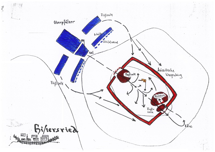 Die Bö̈hmen versuchen, bei Hiltersried „an dem Berg" zur Wagenburg aufzufahren. In der Geschichtsschreibung gilt der Hussitenbirl als Ort der Schlacht. Ein paar hundert Meter südlich des Denkmals, das im 20. Jahrhundert aufgestellt wurde, fahren die Hussiten auf. Die Längsseite weist in Richtung der größten Gefahr - nach Hiltersried. Die Eingänge waren dann zweckmäßigerweise an den Schmalseiten, hier erwartet man den Feind nicht, hier aber kann der Feldhauptmann die Hussiten überraschen. Man hat die rechteckige Form der Wagenburg gewählt, so kann man schneller auffahren als bei der ovalen Form (Abb. 24).
