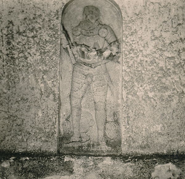 Dieses Bild zeigt das einzig in Geigant erhaltene historische Relikt - den Epitaph eines Kagerers, fotografiert um 1955, an der Nordseite der inzwischen abgerissenen alten Geiganter Kirche.