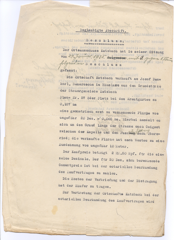 Die Ortschaft Katzbach verkauft an Joseph Stadler von Katzbach aus dem Grundstücke Pl. Nr. 13 der Steuergemeinde Katzbach (Gänseanger) eine Fläche von 20 Dezimalen. Der Kaufpreis beträgt für die einzelne Dezimale 1,50 M. Die Kosten der Verbriefung und der Eintragung hat der Käufer zu tragen. Zur Vertretung der Ortschaft Katzbach bei der notariellen Beurkundung wurde Herr Joseph Dankerl aus Katzbach bevollmächtigt. Derselbe ist ermächtigt, Namens der Ortschaft Katzbach alle erforderlichen und sachdienlichen Erklärungen abzugeben und Anträge zu stellen. Der Ortsausschuß Katzbach.