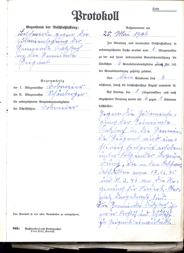 Gegen die Zusammenlegung der Gemeinde Katzbach mit der Gemeinde Geigant wird einstimmig  Einspruch erhoben unter folgender Begründung, die in den Beschwerdeschriften vom 17. 12. 45 und 11. 3. 46 an die Regierung Niederb.-Oberpfalz dargebracht sind. Die Gemeinde Katzbach ist zwar kirchlich und schulisch zu Geigant einverleibt,  müssen aber die Kinder im Winter viele von der Schule und die älteren Leute von der Kirche daheim bleiben da die hiesigen winterlichen Verhältnisse und weite Entfernungen dieses nicht zulassen. Vor geraumer Zeit war in Katzbach ein Schulhaus angestrebt, dieses Vorhaben konnte mangels an Mitteln nicht ausgeführt werden.