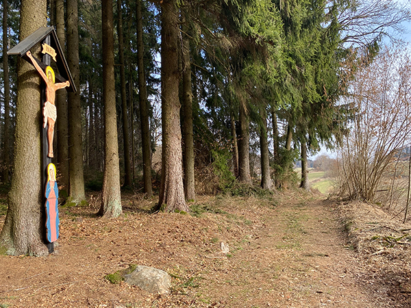 Viele Tage musste das Ehepaar Feiner opfern, um das Ensemble so zu gestalten, dass es auch für Wanderer und Grund-Anlieger ein ansehnliches Gesicht bekam. Dazu setzten die Feiners gegenüber dem Kreuz zwei senkrechte Granitsteine, die eine Holzbank tragen. Auf der könnte man sich sitzend und vielleicht auch betend dem Herrgott mit seiner Schöpfung widmen.