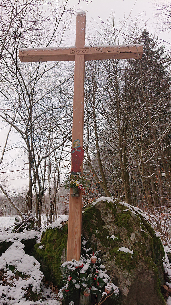 Das Ehepaar Feiner holte vor kurzem die neuen und frisch bemalten Holztafeln in Unterfranken wieder ab und gingen an die Arbeit, das Holzkreuz wieder so herzustellen, wie es einmal gewesen ist. Da der senkrechte Balken noch ein „gehauter“ und nicht geschnittener Balken war, wurde es notwendig, dass auch der Querbalken wieder als gezimmerter Vierkant erneuert werden musste, um das Aussehen möglichst wenig zu verändern. Tatsächlich fand sich im Feiner-Anwesen so ein Stück, dass genau denselben Querschnitt hatte, wie der Längsbalken. Die offizielle Denkmalpflege könnte es wahrlich nicht besser machen!