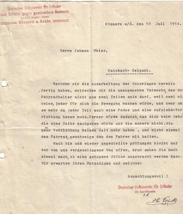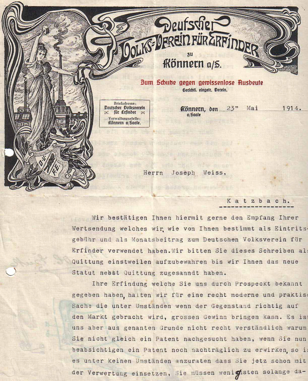 Schreiben des Deutschen Volksvereins für Erfinder