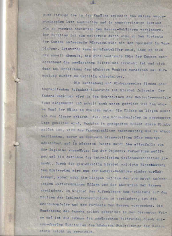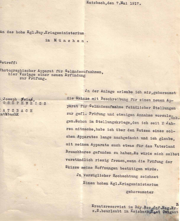 Josef Weiß dachte hier vor allem an Aufnahmen aus den Schützengräben. Er befand sich zu dieser Zeit im Reservelazarett in Amberg und war nach Katzbach beurlaubt. Da er wieder mit dem baldigen Fronteinsatz rechnen musste, fragte er bereits 2 Wochen nach Vorlage seiner Erfindung beim Kriegsministerium nach, ob die Idee realisiert werden kann.