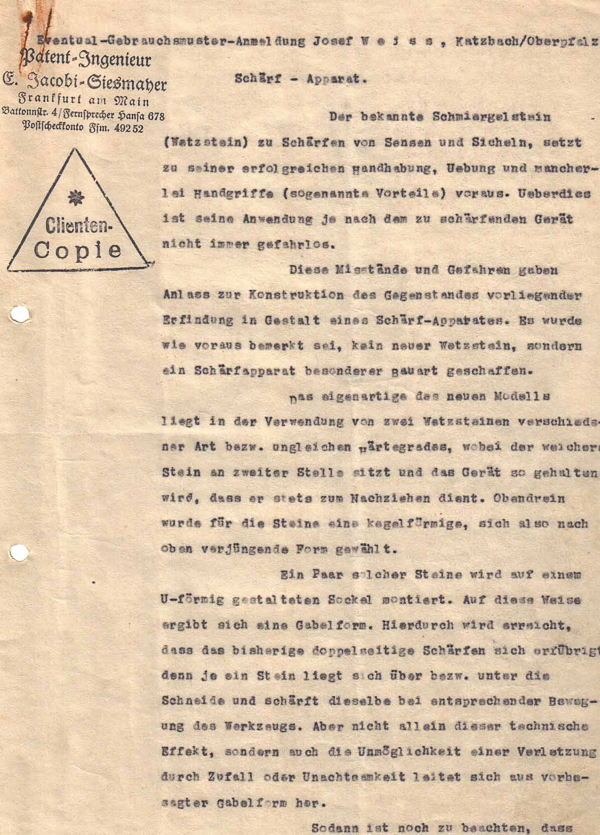 Josef Weiß kam selbst aus der Landwirtschaft und seine Ablehnung gegenüber dem herkömmlichen Wetzstein dürfte seine Überlegung, einen neuartigen Schärfapparat zu erfinden, beflügelt haben.