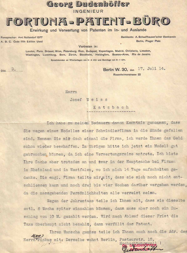 Ein umfangreicher Schriftverkehr, vor allem mit dem beratenden Ingenieur für Patentwesen sowie dem Deutschen Volksverein für Erfinder lassen erkennen, wie schwierig es war, eine zum Patent angemeldete Erfindung auch zu vermarkten.