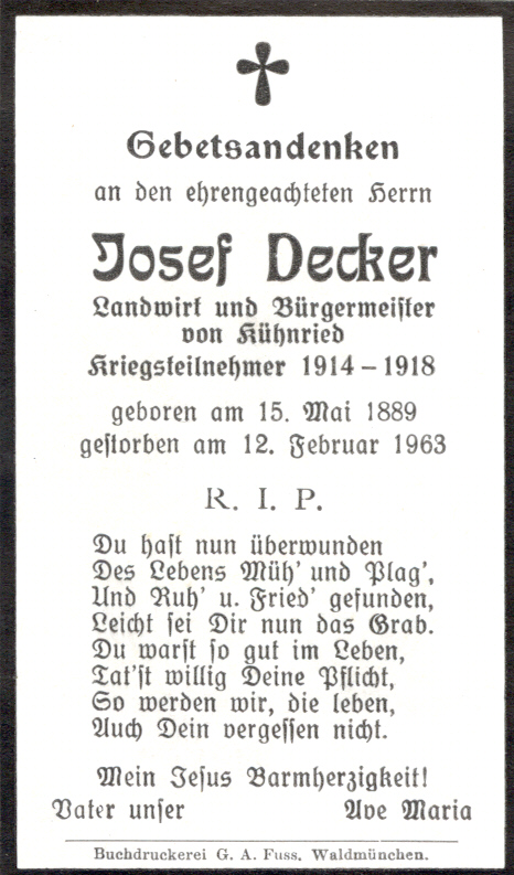 Sterbebild Decker Josef, Kühnried