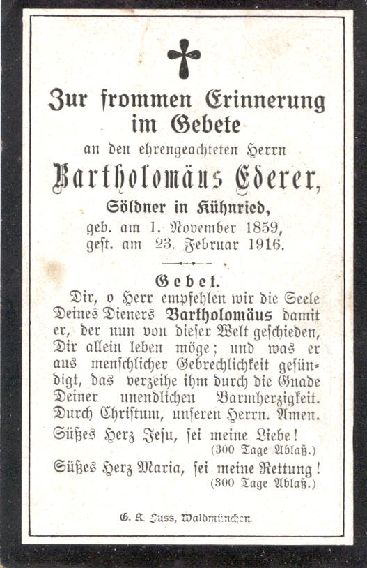 Sterbebild Bartholomäus Ederer, Kühnried 5, der Gründer der Katzbacher Feuerwehr