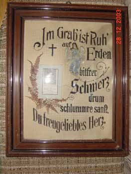 ![]() Zum Gedenken an Xaver Ederer Katzbach 8 hat seine Mutter des Gefallenen einen alten gestickten Haussegen umgearbeitet und sein Sterbebild darin eingerahmt