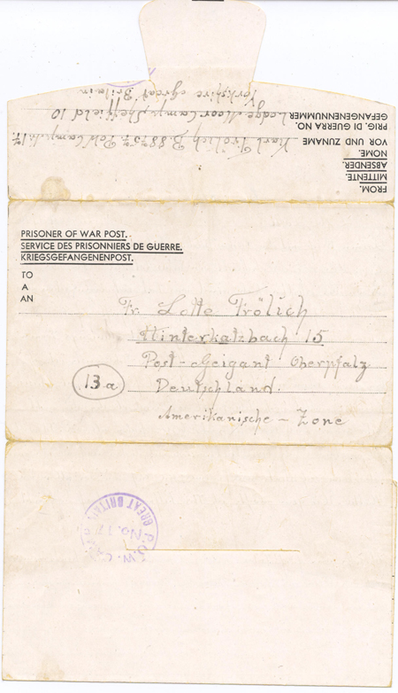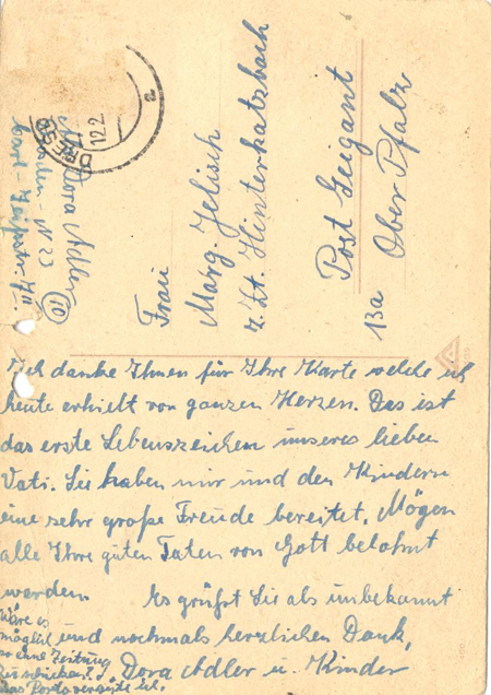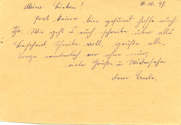 Für die Ehefrau Anna Kraus war es vermutlich eine Erlösung, als sie aus dem Kriegsgefangenenlager Post von ihrem noch lebenden Ehemann erhielt. Die erste datiert zum 4. 12. 1946, die nächste vom 25. 5. 1947 und die letzte Nachricht vom 10. 10. 1947