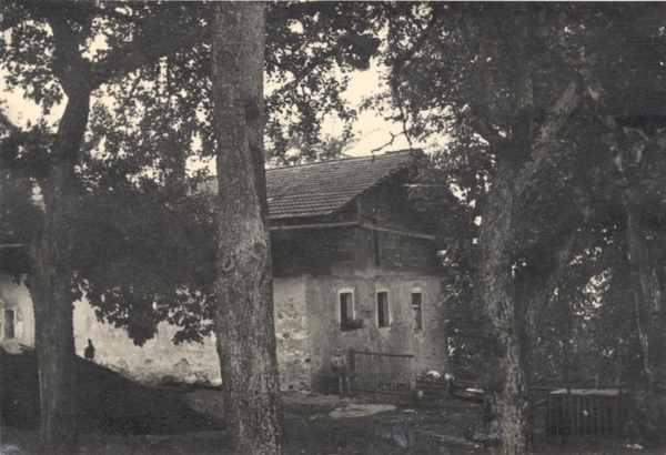 Nordostseite des Hauses mit Holzdachrinne , am Hauseck steht ein kleiner Junge, es ist leider unbekannt, wer das ist.