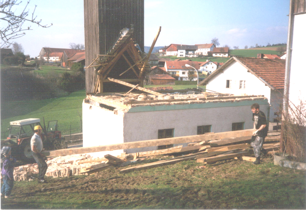 Das alte Feuerwehrhaus, das unterhalb des Anwesens Haus Nr. 16 (Scholerhof) stand und im Jahre 1958 erbaut wurde. Die Abrissarbeiten wurden durch die Familie Lommer Peter und Fanni übernommen.