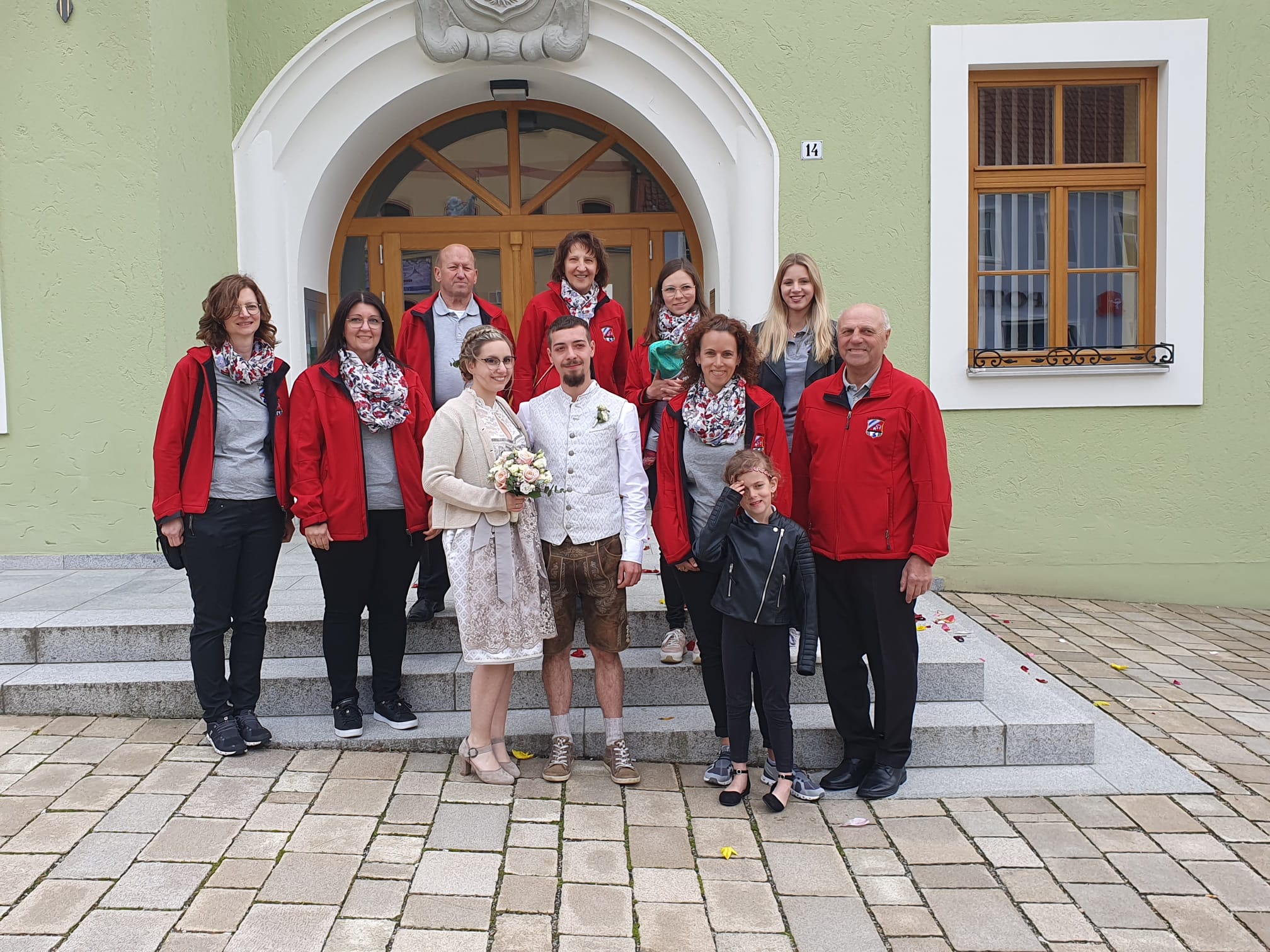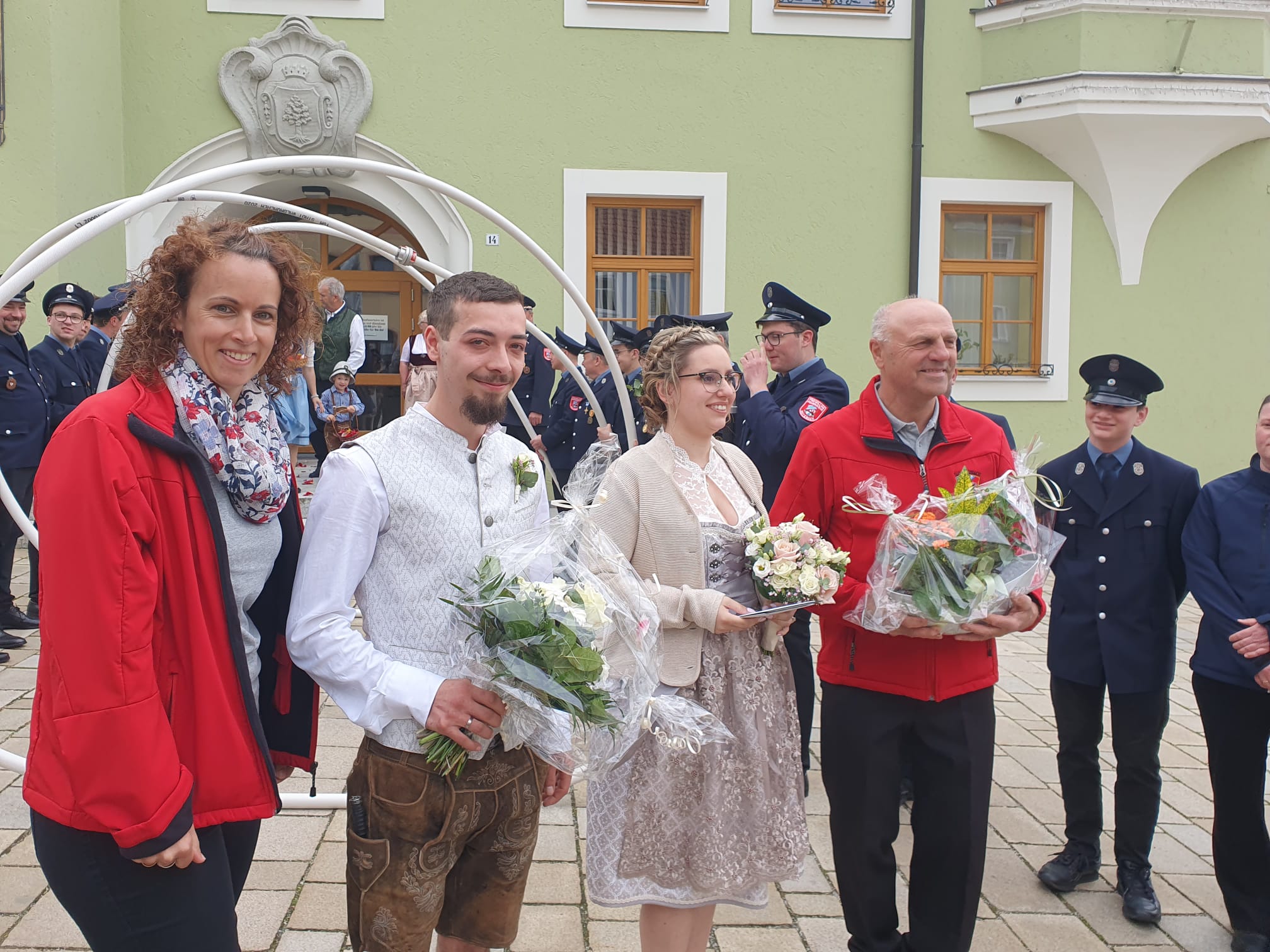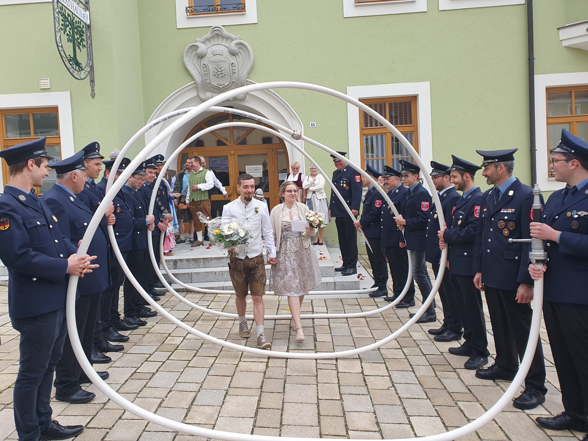 Die Sportgemeinschaft Katzbach und die Freiwillige Feuerwehr Katzbach ließen es sich nicht nehmen, in großer Zahl vor dem Waldmünchner Rathaus auf das frisch vermählte Brautpaar zu warten und bildeten dazu ein wirklich großes Spalier, mit Schlauchspirale und kleinen Präsenten für das frisch getraute Paar.