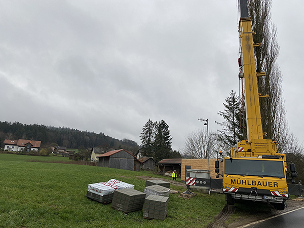 Bereits zwei Wochen früher wurde dafür ein entsprechendes Fundament betoniert und vorbereitet. Dieses wurde auf 3 mm genau justiert, sodass das Verteilerhäuschen ohne Probleme aufgesetzt werden konnte. Bereits vor 7 Uhr früh war der überbreite Tieflader der Spedition Dietz vor Ort und gleich danach kam auch ein vierachsiger großer Autokran der Firma Mühlbauer auf die Baustelle. Nachdem die Verkehrssicherung auf der Staatsstraße installiert war, begann das Versetzen des Knoten-Häuschens.