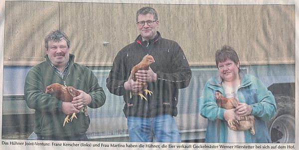 Werner Hierstetter aus Furth im Wald ist der Abnehmer der Bio-Eier und verkauft sie im Automaten. Franz Kerscher, seines Zeichens Geschäftsführer des Bauernverbandes in Cham und seit langem zertifizierter Bio-Landwirt in Katzbach hat sich gemeinsam mit seiner Frau Martina ein weiteres Standbein geschaffen – die Produktion von Bio-Eiern.