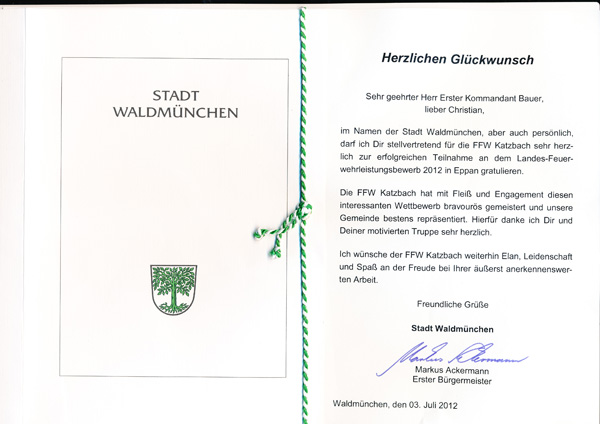 Da auch die Kinder der Wehrdamen/männer mit dabei waren, wurde am Freitag ein Ausflug auf die größte Alm der Welt, die Seiser Alm unternommen. Die Kinder konnten rumtollen und die Erwachsenen genossen den Ausbilck auf das Dolomitenpanorama von der Puflatsch-Alm aus. Auf dem Rückweg zur Unterkunft wurde noch ein kleiner Abstecher an den großen und kleinen Montiggler See, zwei idyllische und beliebte Badeseen in Südtirol gemacht. Die Besonderheit am kleinen Montiggler See ist, dass hier im Winter Sauerstoff zugesetzt wird, um die Wasserqualität zu verbessern, sauerstoffarmes und sedimentreiches Tiefenwasser wird am großen See abgepumpt. Die Bewerbseröffnung fand am Freitagabend statt. Der Einmarsch der Fahnenabordnungen, einiger Bewerbsgruppen, der Bewerter und der Musikkapelle St. Michael/Eppan führte vom Maria-Rast-Weg zum Festplatz in St. Michael. Der Bürgermeister Wilfried Trettl und der Landesfeuerwehrpräsident Wolfram Gapp richteten dort ihre Grußworte an die Anwesenden und eröffneten die Bewerbe. Am Samstagmorgen um 7.00 Uhr gingen dann die ersten Jugendgruppen und Gruppen der aktiven Feuerwehrleute in der Sportzone von Rungg an den Start. Auf den zwei nebeneinander liegenden Sportplätzen war ein reibungsloser Ablauf der Bewerbe gewährleistet. Auf 12 Bahnen galt es die insgesamt 600 Starte abzuwickeln. Für die Bewertung standen 110 Bewerter zur Verfügung. Rund 2.500 Feuerwehrleute und 1.000 Jugendfeuerwehrleute aus Südtirol, aus dem Trentino, Österreich und Deutschland waren vom 22. bis 24. Juni 2012 bei den Leistungsbewerben für die aktiven Gruppen und Jugendgruppen in der Sportzone von Rungg dabei. Bei leichtem Regen wurde das Leistungsabzeichen des Landes Südtirol in Bronze erfolgreich abgelegt. Nach den Bewerben wurde wieder bei strahlendem Sonnenschein der restliche Tag in Meran verbracht, wo natürlich ein Spaziergang an der Promenade nicht fehlen durfte. Bei der Schlussveranstaltung konnte Landesfeuerwehrpräsident Wolfram Gapp neben den Teilnehmern und Bewertern auch zahlreiche Ehrengäste begrüßen, darunter auch Landeshauptmann-Stellvertreter Hans Berger, Bürgermeister Wilfried Trettl, zahlreiche Feuerwehrfunktionäre aus dem ganzen Land und hochrangige Feuerwehrfunktionäre aus dem Trentino, Deutschland und Österreich. Bei dieser Abschlussveranstaltung erhielten auch die Katzbacher ihr Leistungsabzeichen. Mit dem Einholen der Bewerbsfahnen wurde die Veranstaltung offiziell abgeschlossen. Die Rückreise mit dem Leistungsabzeichen in der Hand eines jeden Einzelnen wurde am Sonntag den 24. 6. 12 angetreten. Bemerkenswert für die kleine Katzbacher Wehr ist, dass sie nun schon zum 3. Mal in Folge an internationalen Bewerben teilnehmen und jedes mal erfolgreich sind. Folgende Personen erhielten das Leistungsabzeichen: