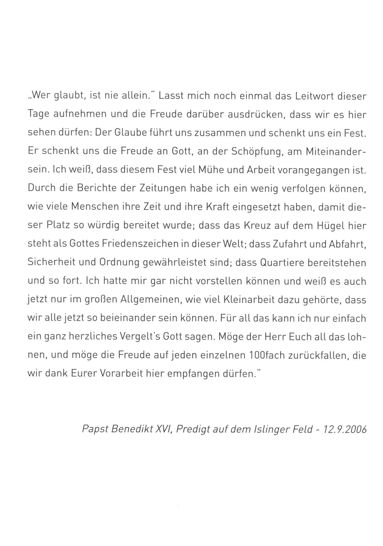 Gerätewart Georg Streck, Daniela Ederer und Kommandant Christian Bauer wurden vom Vorstand nach Waldmünchen gefahren und von da gings mit dem Bus nach Regensburg zum Einsatz für die große Papstmesse am Islinger Feld. Zusammen mit vielen anderen Feuerwehren aus dem Landkreis Cham wirkte unsere Wehr mit bei Ordnungsdiensten, Organisationen des Ablaufs usw. Vor Weihnachten 2006 ist nun eine Ehrenurkunde des Bistums Regensburg eingetroffen, die nun eingerahmt ihren Platz im Aufenthaltsraum des Gerätehauses gefunden hat.