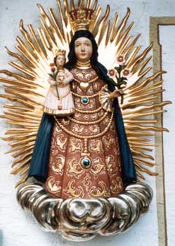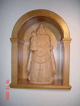 Und gerade hier beginnt die eigenartige Besonderheit der Dorfner Madonna in Katzbach. Denn diese ist kein Bild, sondern eine Holzplastik, die aber genau die selben Merkmale aufweist wie die bekannten Abbildungen. Bis heute sind nur 4 geschnitzte Dorfnerinnen bekannt, einmal die aus Götting bei Rosenheim, einmal die vom Kuglhof bei Obernried (unten)