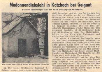 In der Zeitung Bayerwald Echo Samstagsausgabe vom 23. 2. 1963 wurde berichtet, dass die Katzbacher Mutter Gottes am 18. 2. 1963 aus der Kapelle gestohlen wurde.