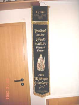 Die Dorfner Madonna schmückt seit 1990 auf dem Erinnerungsband der Festmutter Elisabeth Ederer als wertvolle Stickerei die Fahne der FFW Katzbach.